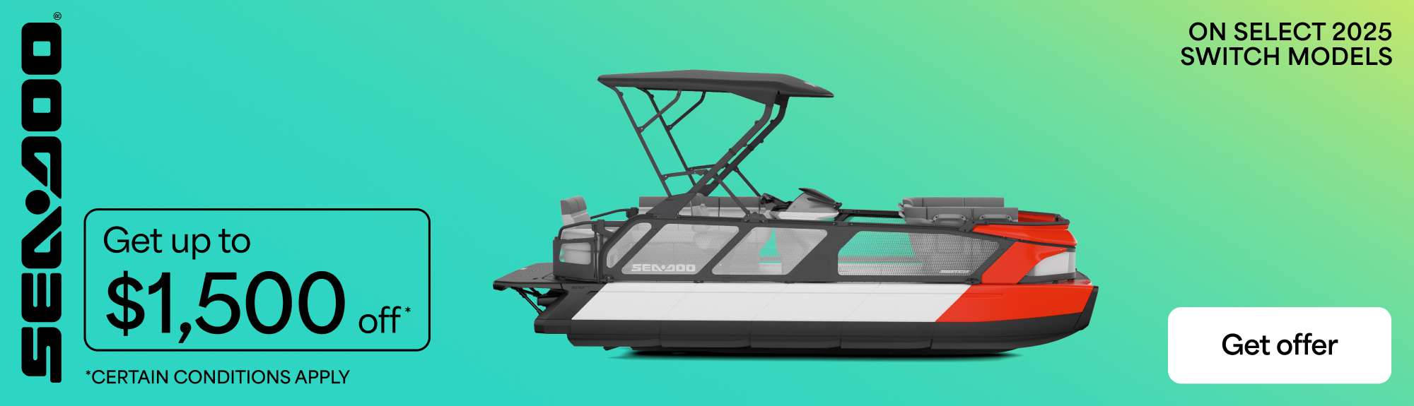 Rebates up to $1,500 or financing starting at 1.99% or 36 months on select 2025 Sea-Doo Switch models