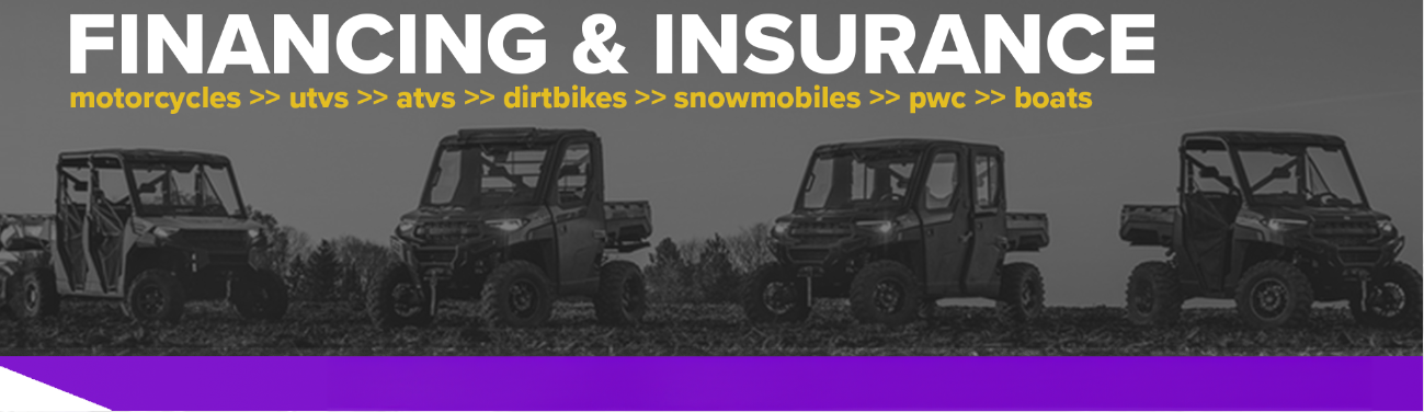 You can finance your new ATV, boat, motorcycle/scooter, personal watercraft, snowmobile and UTV through us. With a minimum down payment and approved credit, you’ll be on the road a few hours after picking out your Can-Am, Honda, Kawasaki, Polaris, Sea-Doo, Ski-Doo, Suzuki, Yamaha, Tracker, Sun Tracker, Ranger, Regency, Nitro, Tahoe, or Mako. Plus you can add in all your accessories, apparel, insurance, and more. You'll have everything you need with only one monthly payment.